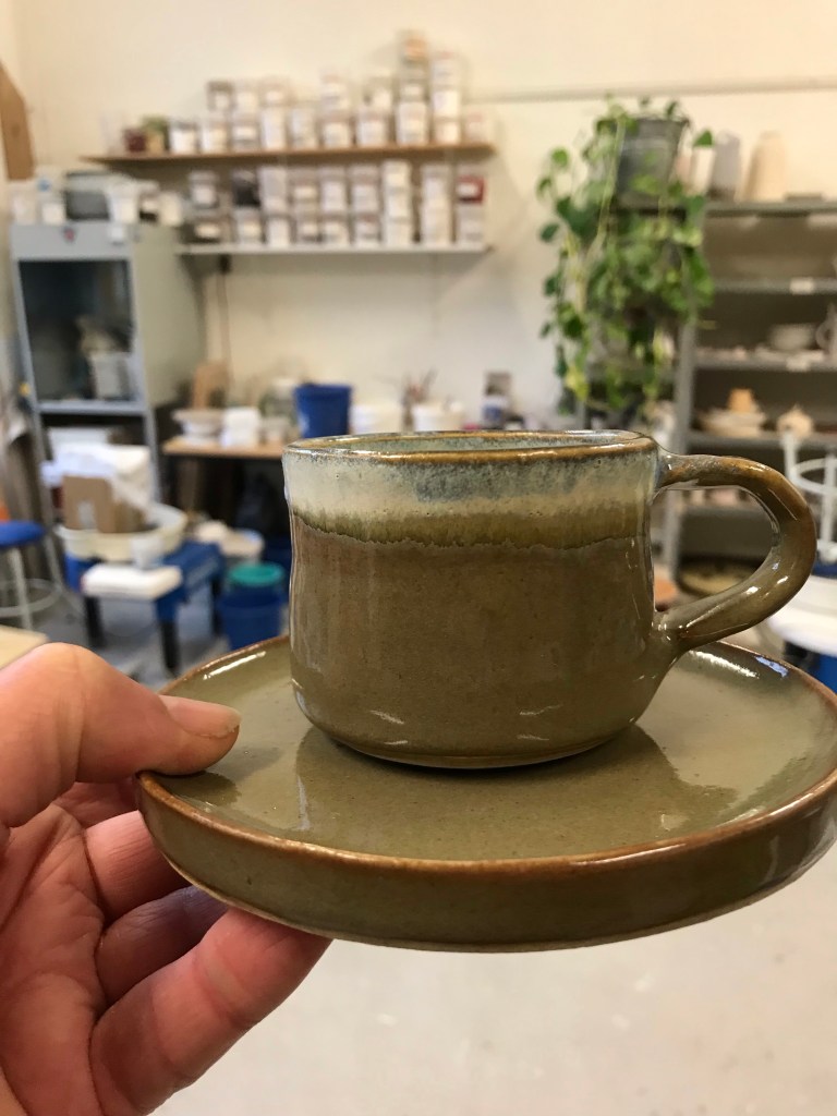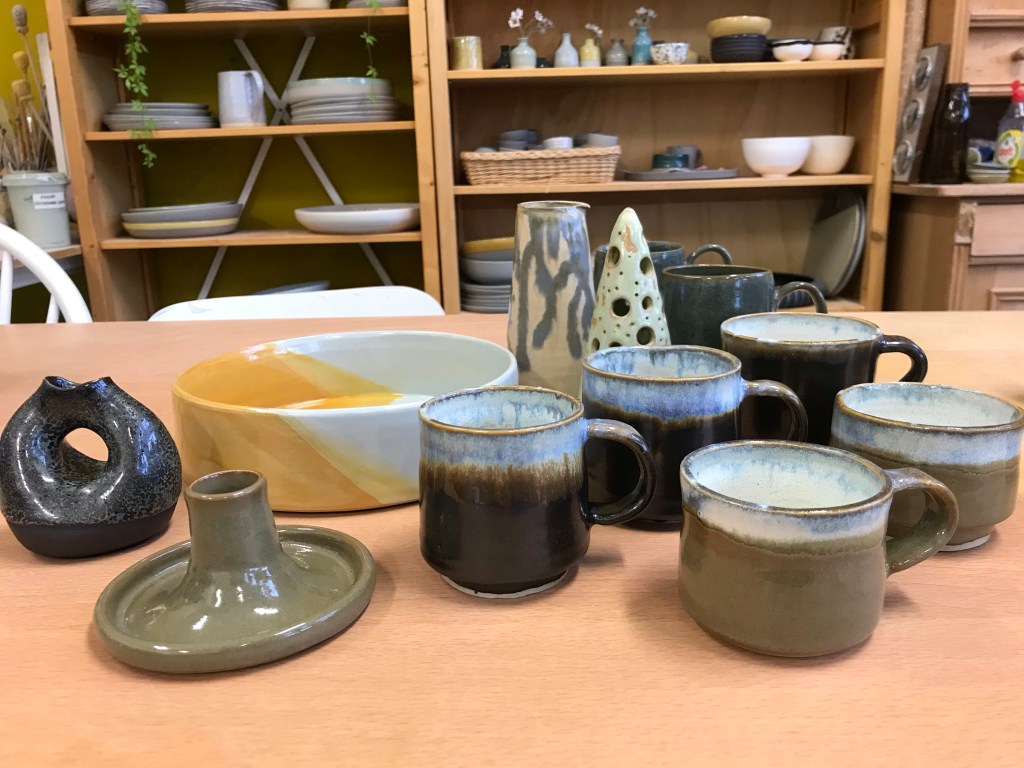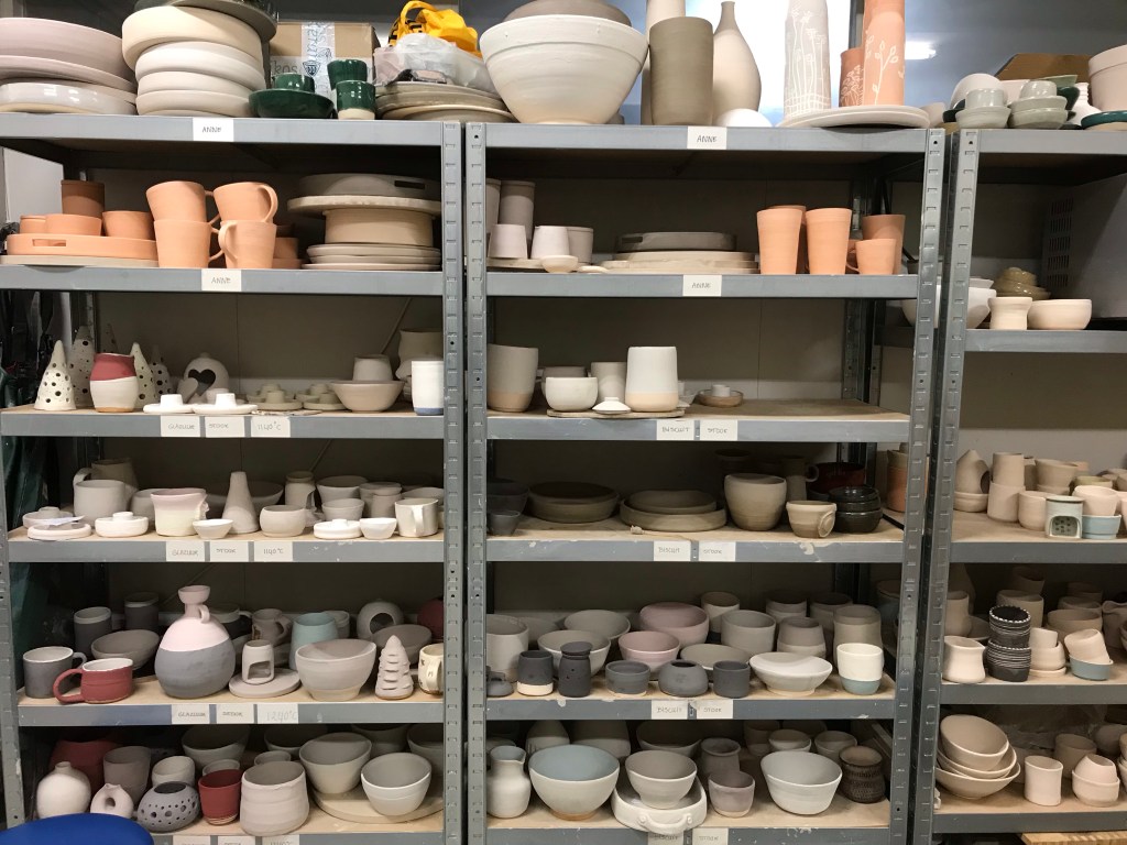 De kast is goed gevuld met werk dat klaarstaat voor de glazuurstook. Uit de eerste stook zijn weer mooi resultaten gekomen.